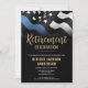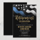 Este design apresenta uma bandeira da polícia com listras pretas e brancas, e uma fina faixa azul de linha também. O texto "A lenda está se aposentando" fica acima de todos os detalhes do partido para o polícia aposentado, xerife, capitão ou chefe do partido de aposentadoria.