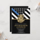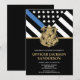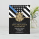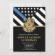 Este design apresenta uma bandeira da polícia com listras pretas e brancas, e uma fina faixa azul de linha também. O crachá da polícia e o texto do ouro estão acima de todos os detalhes do partido para os detalhes do polícia aposentado, xerife, capitão ou chefe do partido aposentado.