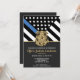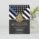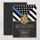 Este design apresenta uma bandeira da polícia com listras pretas e brancas, e uma fina faixa azul de linha também. O crachá da polícia e o texto do ouro estão acima de todos os detalhes do partido para os detalhes do polícia aposentado, xerife, capitão ou chefe do partido aposentado.
