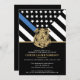 Honre a dedicação e o trabalho de duro de um novo oficial de polícia com este convite de formatura policial personalizável. Apresentando um crachá policial e a bandeira da polícia com riscas brancas e pretas e uma orgulhosa linha azul fina, esta design simboliza força, serviço e sacrifício. O convite é personalizado com o nome do formando em letras douradas, fazer-o como uma lembrança memorável para amigos, familiares e colegas oficiais. Perfeito para celebrar a graduação, promoção ou marco de uma academia de polícia na carreira de um futuro oficial. Convide seus convidados em estilo e mostre suporte para o membro mais novo da comunidade de linha azul fina.