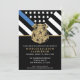 Este design apresenta uma bandeira da polícia com listras pretas e brancas, e uma fina faixa azul de linha também. O crachá da polícia e o texto do ouro estão acima de todos os detalhes do partido para os detalhes do polícia aposentado, xerife, capitão ou chefe do partido aposentado.