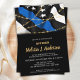 Convites para Graduação da Polícia de Linha Azul-fina. Comemore sua nova academia de polícia, e convide amigos e familiares para a festa de formatura de seu policial com este Convite à Graduação da Polícia de Bandeira Azul Thin. DESIGN americano na Polícia de Sinalizador, cores modernas, preto preto branco e azul com as luzes de cordas de ouro design. Este convite para a formatura do policial também é perfeito para convites de aposentadoria da polícia, mudança de local na personalização. Veja a nossa coleção para combinar presentes de formatura policial, favores de festas de formatura da academia de polícia e suprimentos. COPYRIGHT © 2021 Judy Burrows, Black Dog Art - Todos Os Direitos Reservados. Licenciado Policial Thin Blue Line Invitation