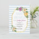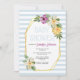 Polígono de folha de ouro e flores de cor d'água, chá de núpcias azul pálidas. Apresenta um belo buquê de flores de aquarela em roxo, amarelo e branco e folhas. O texto está em um quadro branco com moldura de polígono de folha de ouro. Por trás dele há um padrão listrado com listras claras, azuis e brancas.
