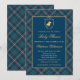 Chuva de Bebê Equestre Polo Xadrez Azul Clássico - Um convite de chuva de bebê clássico e elegante com elementos equestres e xadrez em azul marinho e verde caçador com detalhes em tom dourado e vermelho burgundy. Um jogador de polo em silhueta de cavalo adorna o topo com um brasão monogramado e o padrão tartan adiciona um toque clássico e atemporal. Perfeito para uma chuva de bebê temática Old Money com um visual clássico, vintage e luxuoso. Se você gosta de grandpa core, estilo vintage, este é um ótimo convite de chuva de bebê. Disponível em impressão e como download digital. Personalize este modelo de convite de chuva de bebê editável com os detalhes do seu evento.