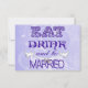 Pombas com alianças de casamento em fundo roxo pastel suave para RSVP.