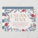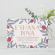 O convite para janto Rosh Hashanah, vermelho, azul e dourado, apresenta uma ilustração romântica de Shelby Allison.