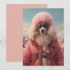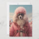 Imagem engraçada de um Poodle Rei no Polo Norte usando um casaco de inverno rosa fofo e óculos de neve