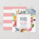 This cute "pool party" bridal shower invitation features a white background with a beach umbrella, flip flops, tropical mason-jar drink/cocktail, popsicle, watermelon, donut, pineapple, straw hat, fresh coconut drink, pinwheel and sunglasses. The reverse side features a white background with pink stripes. Personalize it for your needs. You can find more matching products at my store.