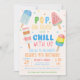 Convide convidados para a festa de aniversário temática de picolé do seu filho com os nossos convites para a festa de aniversário "Pop por cima e Chill". Os convites de festas de aniversário bonitos apresentam picolés de geleiras e tipografia de tendências. Personalize os convites de festa de aniversário tematizada de gelado com o nome, a idade e os detalhes da festa do seu filho.