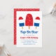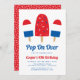 Convites de festas de aniversários de 4 de julho com ilustrações de picolés vermelho, branco e azul no topo do design. A frase "pop sobre" é exibida em um script azul em negrito com o nome, a idade e os detalhes da festa do seu filho mostrados abaixo. A festa de aniversário de 4 de julho convida à reversa para exibir um padrão de borrifadas vermelhas e brancas.