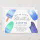 Convites de festas adoráveis para a sua pequena festa de aniversário de verão apresentam quatro ilustrações de picolé de cor d'água em tons vibrantes de azul e verde, com "pop-on over and chill with us" em letras brancas de roteiro. Personalize com seus detalhes de festa de aniversário abaixo.