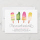 Convites de festas adoráveis para a sua pequena festa de aniversário de verão apresentam quatro ilustrações de picolé de cor d'água em tons vibrantes de rosa e verde limão, com "pop on over and chill" embaixo de uma letra de script caprichoso. Personalize com seus detalhes de festa de aniversário abaixo. Cartões invertidos a rosas sólidas.