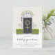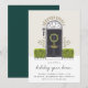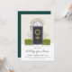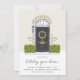 Um convite encantador para festas de férias apresenta uma ilustração esboçada de porta preta, flanqueada com arbustos verdes, com a inscrição manuscrita de "casa de férias aberta". Personalize com seus detalhes da festa de Natal embaixo.