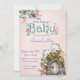 Esse convite de chá de fraldas mágico e caprichoso apresenta um tema de floresta encantado. Uma imagem de uma porta de fada em um pequeno jardim de cogumelos é colocada no fundo, com uma fada flutucando sobre ela. O fundo é um rosa esmaecido.