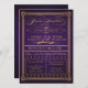 Este belo e profundo convite para casamento roxo de beringela com texto de ouro cremoso tem uma sensação vintage, antiquada com design de carta antiquada, incluindo elementos elaborados de escrita, uma faixa decorativa, estrelas e um amante suave. O convite para o rico é inspirado por posters de design e na moda. O texto diz: "Você é Convidado para o casamento de [nome personalizável] & [nome personalizável] [data personalizável] [hora personalizável]. Por favor, junte-se a nós para uma Celebração Inesquecível". Personalize ainda mais o convite com a cerimônia de casamento e as informações e endereços de recepção, cada um na sua própria caixa com fronteiras pontilhadas.