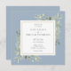 Apresentando delicadas folhas de cor de água rústica de eucalipto num fundo azul empoeirado. Este convite de casamento botânico moderno pode ser personalizado com seus detalhes especiais de casamento. Projetado por Thisnotme©