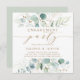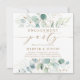Este convite quadrado de festa de noivado apresenta cores aquáticas pintadas de eucalipto, folhas botânicas verdes e douradas com guião dourado.