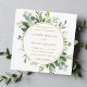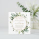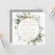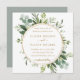 Este convite quadrado de casamento mostra cor d'água eucalipto verde, folhas verdes e um quadro circular de ouro. Para personalização mais avançada deste design, clique no link "Personalizar mais". Itens correspondentes também estão disponíveis.