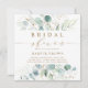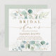 Este convite quadrado de chá de panela apresenta cores aquáticas pintadas de eucalipto, folhas botânicas verdes e douradas com guião dourado.