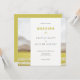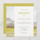 Convite para casamento com a paisagem natural de montanha. Suavidade Natureza paisagem primavera pradarias verdes em floração. Silhuetas de montanhas rochosas castanhas, campos de grama e flores brancas de dandelion. Concurso de Casamento de Pintagem de Aquarela. Pradarias na Coleção Bloom.