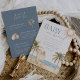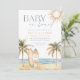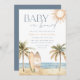 Traga uma vibração costeira relaxada para o seu chá de fraldas com este convite de duas faces da cor d'água "Bebê no Conselho" da Redwood & Vine Design Co. A frente mostra trabalho de arte de palmeiras pintadas à mão, ondas oceânicas, margem arenosa, sol ouro e pranchas, enquanto a parte de trás apresenta um fundo azul empoeirado com ilustrações tropicais, detalhes do registro de presentes e um código QR digitalizável Registros online. Ideal para uma celebração tropical, praia ou inspirada no surf, esse convite emparelha beleza natural com detalhes práticos para uma apresentação completa e elegante.