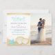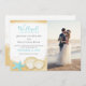 Bonito destino de ouro e praia cor-de-rosa "nós fugimos" anúncio de elopeamento de casamento ou convite com foto. Dourada concha e estrela-estrela com foto e texto editável tanto na frente quanto no verso deste anúncio para mensagens especiais e planos futuros de celebração.