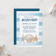 Convite para festas náuticas de Feriado, com pintura manual, conchas de praia a aquarelas com escova, riscas azul-rústicas e brancas. Os detalhes da festa estão em marinho azul e podem ser facilmente personalizados. O lado inverso é um clássico azul marinho.