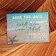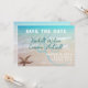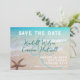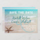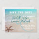 Starfish nos cartões salve a data de praia. Fontes modernas com script manuscrito para nomes da noiva e noiva no centro com um grande "e sinal". O texto impresso branco e preto se alinha à direita na parte inferior da placa. Incluir a data e o local do evento. Impressão menor para a última linha pode incluir, "Convite formal para seguir". As cores são azuis, brancas e marrons para um evento de casamento à beira da natureza. Também disponível como download.