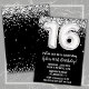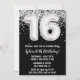 Convite de aniversário 16 preto branco e prata, convite de aniversário 16, para um menino ou menina com escrevendo de escrita moderno e balões de folha divertida.