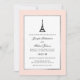 Estes convites para casamento de na moda e chic apresentam uma borda rosa suave e pincelada com uma falso moldura prateada. A icônica Torre Eiffel francesa aparece junto com seu texto em uma elegante fonte preta. A escolha perfeita para um casamento clássico e parisiense. Aqui está a placa RSVP correspondente: