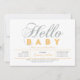 Celebre um dia especial para o seu amado com este chá de fraldas moderno! Este design apresenta uma tipografia simples, mas na moda, "Hello Baby" em textura de brilho prateado. Este design de convite para chá de fraldas é perfeito para uma festa temática de cor prateada e amarela.