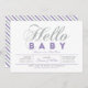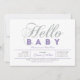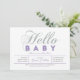 Celebre um dia especial para o seu amado com este chá de fraldas moderno! Este design apresenta uma tipografia simples, mas na moda, "Hello Baby" com textura violeta e cintilante prateada.