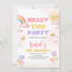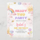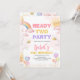 Prepare-se para fazer o entusiasmo com este Convite de Aniversário "Pronto para Duas Festas". Queimado com sol, arco-íris, balões e mamangabas, perfeito para celebrar o seu segundo aniversário doce. Apresentando cores pastéis suaves e ilustrações lúcidas, este convite dá o tom para uma celebração divertida e cheia de alegria. Celebre seu raio de sol com um convite tão brilhante e brilhante quanto ela é! BRT315