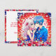 Personalizado, obrigado, anotações para seu casamento temático de anime. Flores vermelhas, azuis e brancas e um casal de anime fofo abraçando-se.