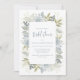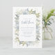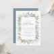 Esta design apresenta jardim de rosa floral botânico, registro de presentes no site de código QR, um URL de digitalização online, flores de chá de panela elegantes chic, um registro de presentes azul empoeirado, uma folhagem verde folhas bebês, um simples script de caligrafia minimalista, uma letra de tipografia caprichosa na moda, uma elegância simplista para a noiva, um chá de panela de casamento convite de festas