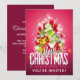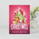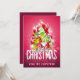 Convite de festa uma ilustração fresca de Natal. O texto diz Feliz Natal & Feliz Ano Novo. Concebido com um monte em forma de árvore de presentes com flocos de neve festivos, estrelas, bolas de natal e brilhos luminosos. O fundo é uma cor rosa avermelhada vibrante.
