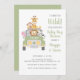Casal de bebê bonito, convite para chá com ilustração de animais do zoológico bebê (leão, elefante, zebra, macaco e girafa) amontoados em um veículo safari e "Está prestes a se tornar selvagem" em tipografia divertida, e "Chá de fraldas" e os nomes da mãe e do pai em coordenação de roteiro verde do exército. Você pode personalizar facilmente os detalhes do chá, mudar o texto "É um menino!" no veículo, e adicionar a data do chá na placa de licença, ou deixar o vazio.