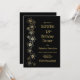 Um elegante convite de festas de janto de 18 anos, surpresa negra, apresentando um spray de flores douradas.