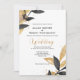 Preto Elegante com Convite Dourado para Casamento desenhado com folhas pretas e douradas sobre fundo branco com cintas pretas e douradas. O texto inclui: Nomes de noiva e noiva, data e hora de casamento, localização e recepção a seguir. O reverso é desenhado com folhas douradas e armação sobre fundo preto. O texto inverso inclui: os primeiros nomes do noivo e do noivo. Para personalizar, basta inserir seus detalhes no nosso modelo, substituindo o texto de exemplo. Não se esqueça de ver toda a Elegante Black With Dourado Wedding Collection para correspondência com artigos de papelaria e acessórios.