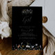 Este preto floral selvagem é um convite para o chá de bebê é perfeito para um chuveiro moderno de bebês ou borrão. A design apresenta flores elegantes, cor-de-água, cor-de-rosa, pincelada, roxa, marinho e branca, com folhas verdes esmeraldas em fundo escuro.