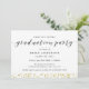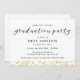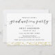 Cartão de convite de festa de formatura personalizado com caligrafia preta moderna e design de confetti dourado.