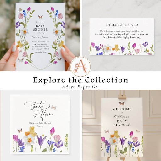 O convite para chás de fraldas temático primavera apresenta uma borda de aquarela de flores e borboletas florescentes de primavera. Personalize com suas informações ou clique em "Clique para personalizar mais" para editar estilos de fonte, tamanho e cores.
