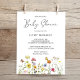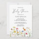 Flores silvestres e borboletas coloridas criam um design botânico rústico para seus convites para chuveiros de bebês. Flores amarelas, laranja, rosa e azuis dançam pelo fundo. As fontes serif e cursivas somam a este design maravilhosamente clássico.