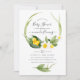Primavera de bebê neutro em gêneros - convite para chás de fraldas páscoas com tipografia elegante, que inclui um bonitinho dormindo em uma lilly florescente do vale com daffodils.