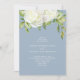 Um convite de casamento elegante e moderno com um belo arranjo de flores brancas de pénia branca e verde. Mostrada com uma cor azul de fundo empoeirada que pode ser personalizada para corresponder ao tema do seu casamento. Basta selecionar o botão 'personalizar' para ver opções adicionais de design.