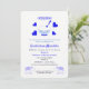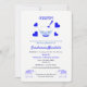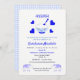 Cartão de convite bonito para as primeiras comemorações do desmame do arroz; em azul e branco com elefantes, tigela de arroz engraçada e um padrão de gingham é ideal para um menino