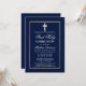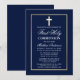 Convite de Primeira Comunhão Azul Marinho Elegante com Cruz. Moldura Dourada.