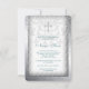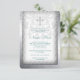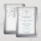 Convite de primeira comunhão com redemoinho de damasco prateado elegante e cruz de pérola branca. Este convite de primeira comunhão de damasco branco é facilmente personalizado para o seu evento, adicionando detalhes do evento, estilo de letra, tamanho e cor da fonte e texto.