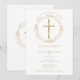 Elegante convite de Primeira Comunhão com grinalda floral de cruz de ouro O nome da pessoa especial é emoldurado em uma delicada grinalda floral e cruz de folha de ouro falsa. Abaixo, os detalhes da Primeira Comunhão são apresentados em tipografia chic. O verso apresenta uma grinalda floral de folha de ouro falsa e um crucifixo combinando. Desenhado por Thisisnotme©