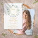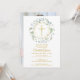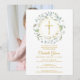 Uma grinalda decorativa de folhagem e uma cruz dourada repousam sobre as informações do convite de sua primeira comunhão especial neste design elegante.